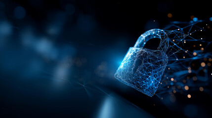 Secure digital network glowing lock blue background, cybersecurity concept, data protection visualization, network security symbolism, encrypted connection representation, with copy space