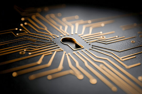 Dark fintech banner with gold circuit lock outline, secure online payments theme