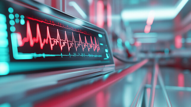 A futuristic hospital monitor displaying a vivid red heartbeat graph, representing advanced medical technology and patient care.