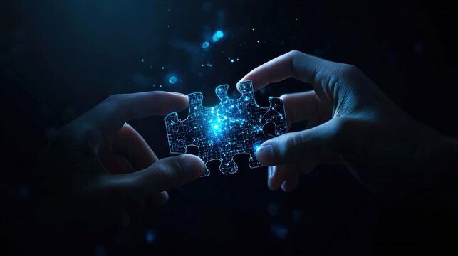 Two hands connecting digital puzzle piece with glowing effects in dark background.