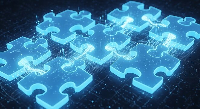 Interconnected puzzle pieces, glowing with a digital network, illustrate the concept of combined solutions.