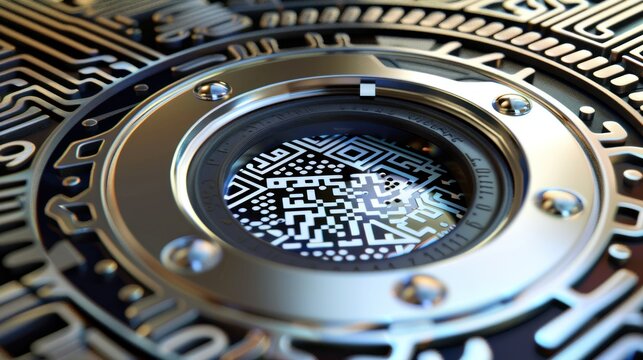 Futuristic QR Code Lens with Intricate Circuitry and HighTech Design for Innovation and Techno