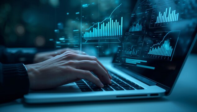 Hands on keyboard with digital stock market charts and analytics interface