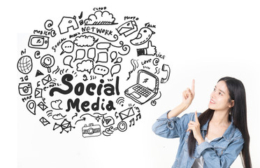 Asian young woman looking up of Hand drawn illustration of social media sign and symbol doodles icon. white background with a social media sketch.