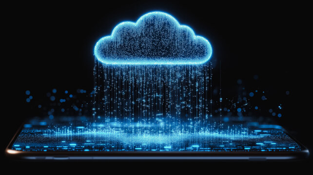 Data Rain:  Digital deluge of information onto a smartphone screen from a glowing cloud symbol.  A futuristic concept of seamless data transfer and cloud computing.