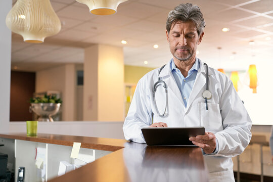 Elderly female tourist wearing wireless headset and using a digital tablet while on vacation. At hotel foyer, receptionist serves male customer with check-in. Great hospitality and technology.