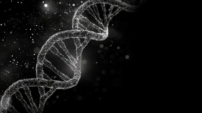 A close up of a DNA strand with a black background. The image is abstract and has a moody atmosphere