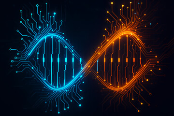 A glowing digital representation of a DNA helix, merging blue and orange circuits and data streams against a dark background, symbolizing genetic technology and innovation.