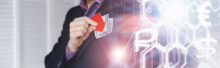 Financial crisis. Concept. Money bills in hand. Arrow symbol of the fall of the national currency. The change in the exchange rate between the Russian ruble and the US dollar.
