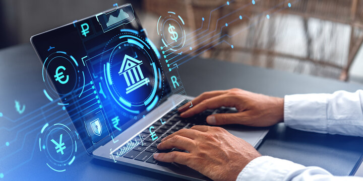 Businessman hands typing on laptop, central bank digital hologram with indicator