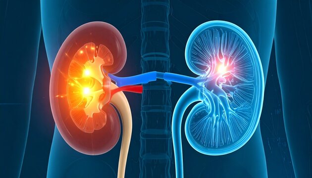 A digital illustration of human kidneys—one inflamed in red-orange, the other calm in blue—connected by arteries and veins, set against a translucent torso and spine. A metaphor for systemic tension a