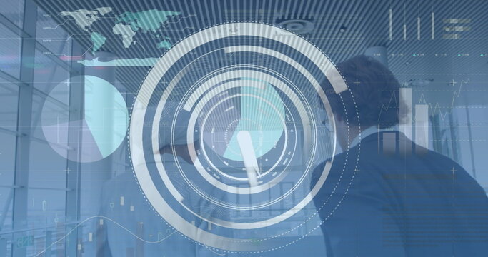 Image of scope scanning and data processing over tech room with computer servers