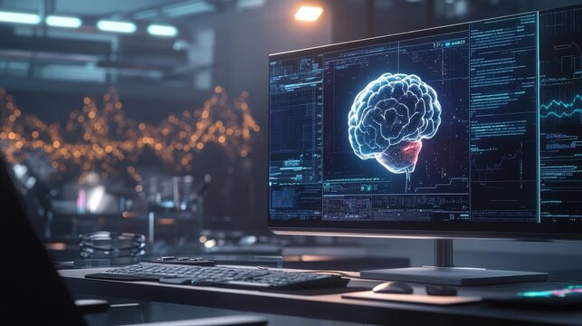 Advanced 3D Brain Model Displayed on a Computer Monitor in a High Tech Laboratory Setting featuring a Glowing Effect.Displayed in a Futuristic and Modern Environment.A Glowing Digital Brain Model on