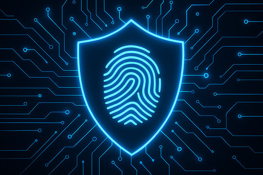 Blue digital shield with fingerprint glowing symbol representing cybersecurity authentication identity privacy and secure access technology