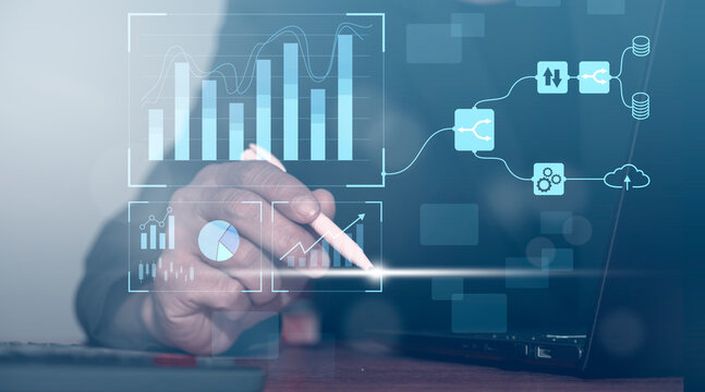 stock market business data graphs display on laptop screen, data analysis graph