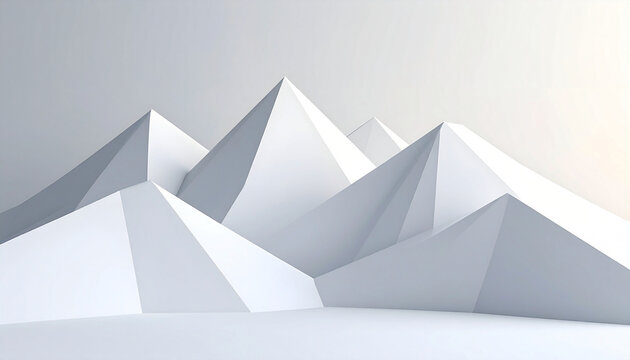 Abstract minimalist grayscale 3D rendering of a range of geometric, pyramidal mountain forms against a light background