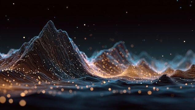 Digital grid covering mountain range at sunset: exploring virtual landscapes. Ai generative