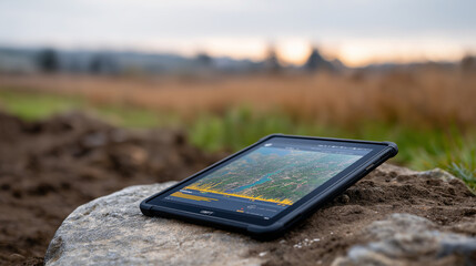 Modern Military Tablet with Offline Map on a Rock in the Field