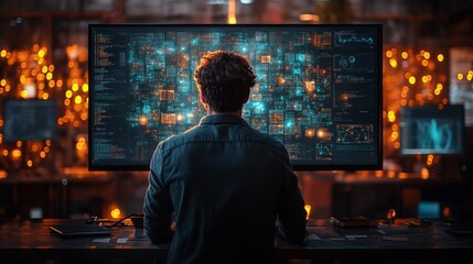 A person analyzes complex quantum computing data on a large screen, surrounded by warm lighting and a tech-oriented workspace, contemplating encryption and security measures against eavesdropping.