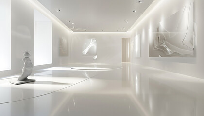 Minimalist Avant Art Gallery featuring interactive digital sculptures in a clean, high-tech space, blending art and technology for engaging experiences,