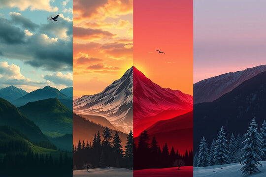 A colorful digital of a mountain landscape with different seasons and times of day