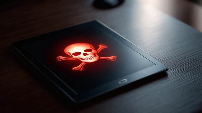 A tablet display shows a glowing red skull and crossbones warning icon in the middle of the screen against a dark grey background and popup illusion, representing a malware cyber threat.