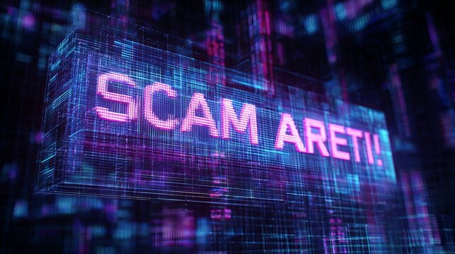 A digital representation of a warning signal featuring the words 'SCAM ARETI!' illuminated in bright pink on a blue grid background.