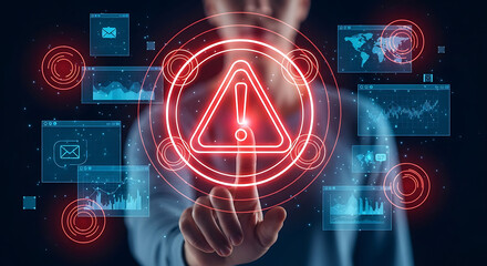 A digital alert symbol glows in vibrant red and blue hues, set against a futuristic background of circuit patterns and technology.