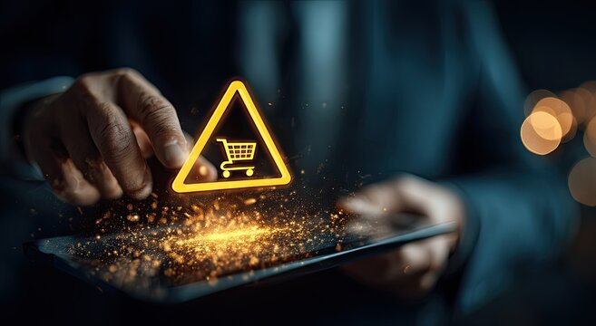 Digital tablet displays glowing shopping cart icon within warning triangle