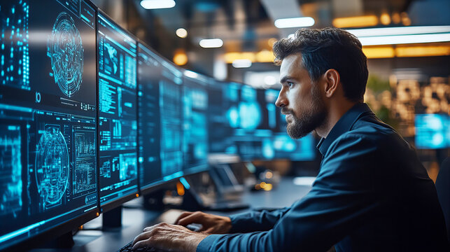 Focused analyst monitoring cybersecurity threats on multiple screens in modern office setting