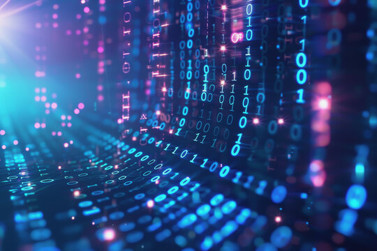 abstract blue and purple binary code background with streaming bytes, perfect for digital tech, programming, and cyber security applications