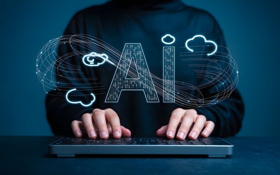 Person typing on a keyboard with a digital overlay of industrial and environmental icons representing technology and sustainability in a modern concept