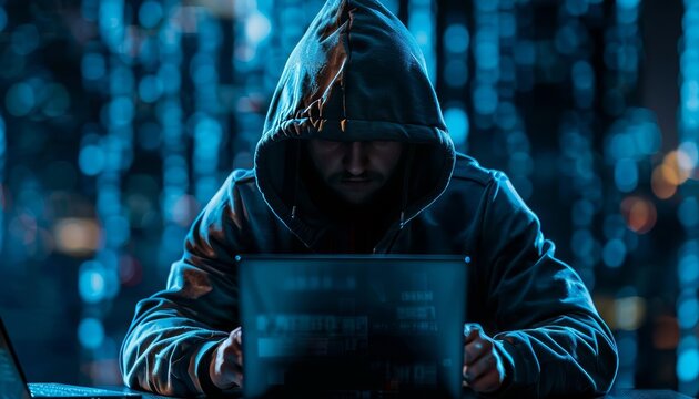 Digital rendering of a hacker manipulating business data, fake malware infiltration, concept of fraud , high resolution DSLR