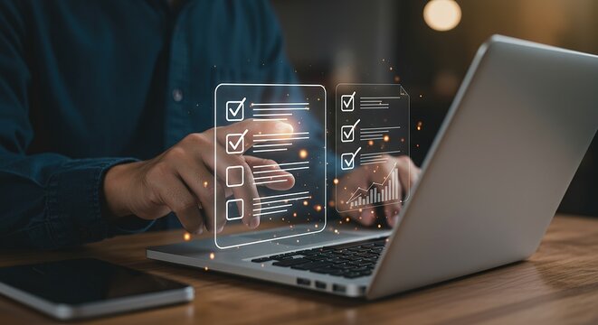 concept of system updating, software installation, or data synchronization. It features a person's hands positioned over a laptop keyboard, with a prominent digital overlay
