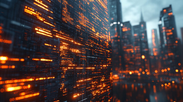 digital background with abstract code symbols, representing advanced technology, innovation, and the intersection of the digital world and human progress. It evokes themes of modernity and complexity