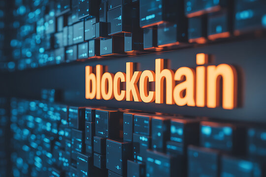 Illuminated blockchain wordmark overlaying a digital network of cubes illustrating technology