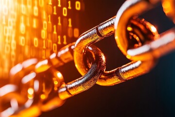 Digital Blockchain: Close-up of Metal Chain with Binary Code Overlay, Security Concept