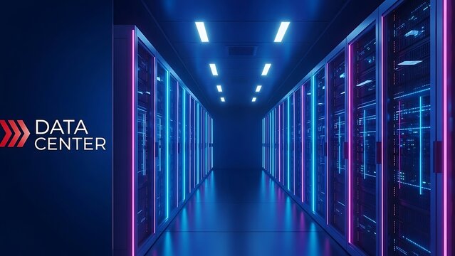 Data center. abstract digital warehouse. Server room of clouds computing technology. Server farm communication with internet. Network connection and information exchange lights glow in the dark.