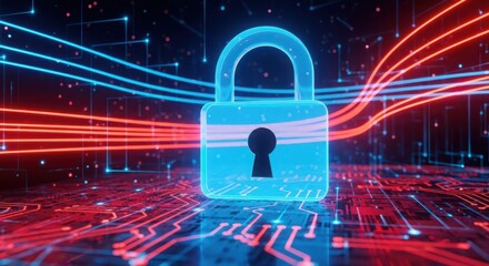 blue holographic padlock with circuit design, symbolizing digital security and technology. glowing elements create futuristic and secure atmosphere