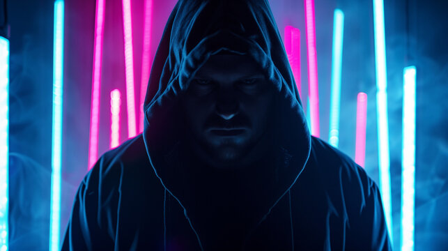 A focused man, dressed in a black robe with a hood on his head, stands in the light of neon lamps in front of a digital screen. Cyber theme. Hacker, secret technology