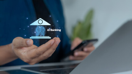 Close-up of hand holding hologram icon of AI banking with brain circuit, representing financial technology, innovation, and smart banking solutions.
