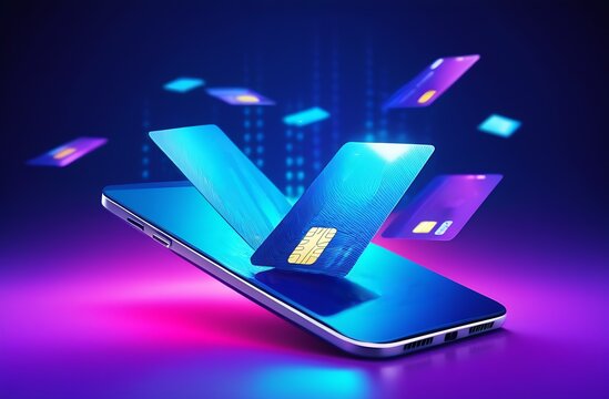 Minimalistic yet Futuristic 3D Rendered Banking Visualization Featuring Overlapping Blue Credit Cards with Gold Embossed Numbers Built in Security Chip and Wireless Payment Symbol