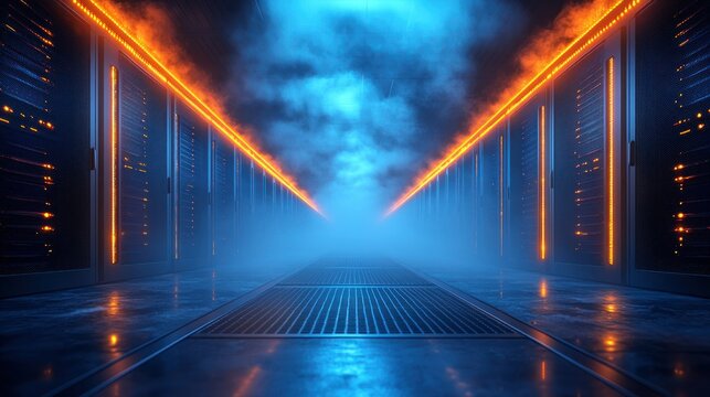 Futuristic server room corridor, glowing lights, smoky atmosphere, data center, technology concept