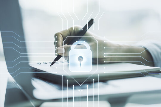 Double exposure of creative lock hologram with chip and hand writing in notebook on background with laptop. Information security concept