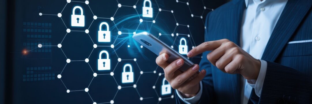 Businessperson interacts with a smartphone displaying a network of security locks.