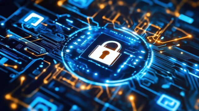 Digital security concept with futuristic padlock and circuit board