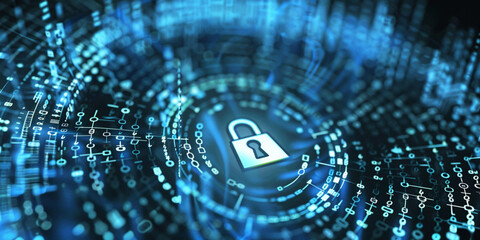 Secure digital padlock with binary code overlay, Cybersecurity and data protection concept