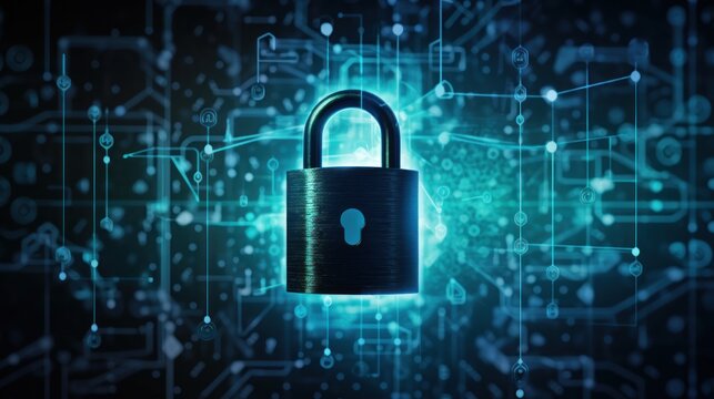 Cybersecurity concept with futuristic glowing padlock for data encryption and protection
