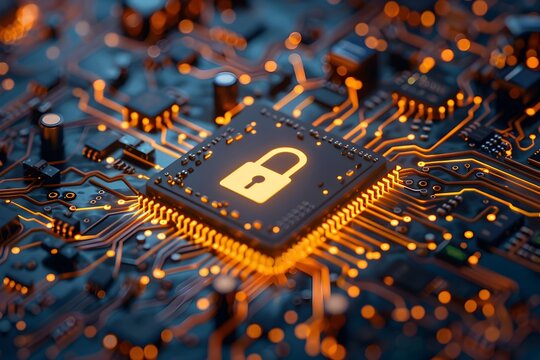 Secure your digital future with this glowing padlock icon embedded in a futuristic circuit board, symbolizing advanced cybersecurity and data protection.