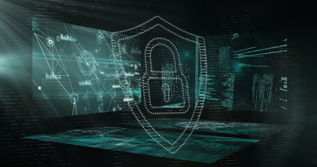Image of padlock icon and data processing over dark background